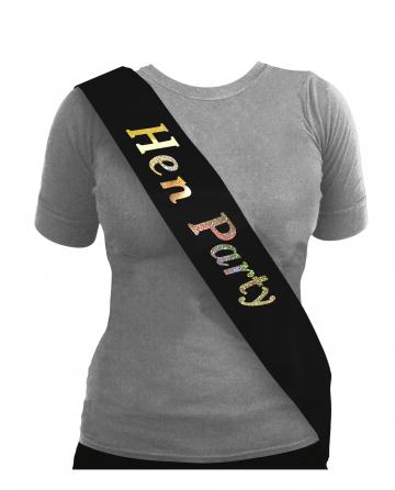 Black Hen Party Sash with sparkling silver foil "Hen Party" print.