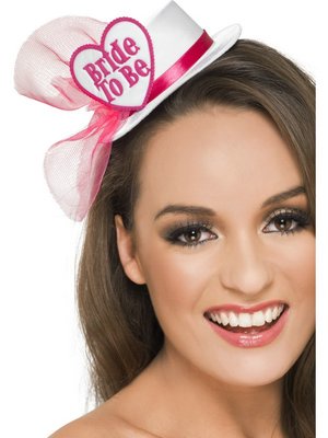 Hen Night Bride To Be mini hat in white with pink lettering, mesh and lace detailing.