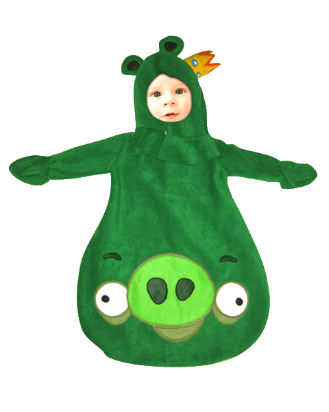 The cute Angry Bird King Pig Baby Costume from the popular phone app features a green bunting costume with long sleeves, matching hood with ears and attached crown. Costume also features a hole for your face and a pair of hand covers.