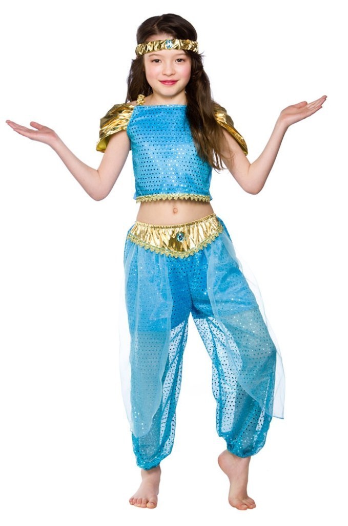 This great costume includes a blue sequinned top and trousers with gold fabric trims and a net overlay on the trousers. The costume is completed with a gold fabric headband with "jewel" trim.