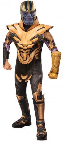 Included in this costume is a padded jumpsuit with gauntlets and a pair of attached boot tops. A padded tabard and a infinity gauntlet are also included. To complete the look a Thanos face mask is also included.