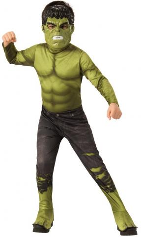 This Kids Avengers Infinity War Hulk Costume includes a one piece printed jumpsuit with attached shoe covers and a Hulk face mask.