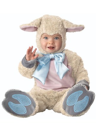 Lil Lamb Costume consists of a lined zippered bodysuit with leg snaps for easy nappy change, attached tail, hood with ears, plus slip-on booties with skid resistant bottoms. (Booties are for indoor use only).