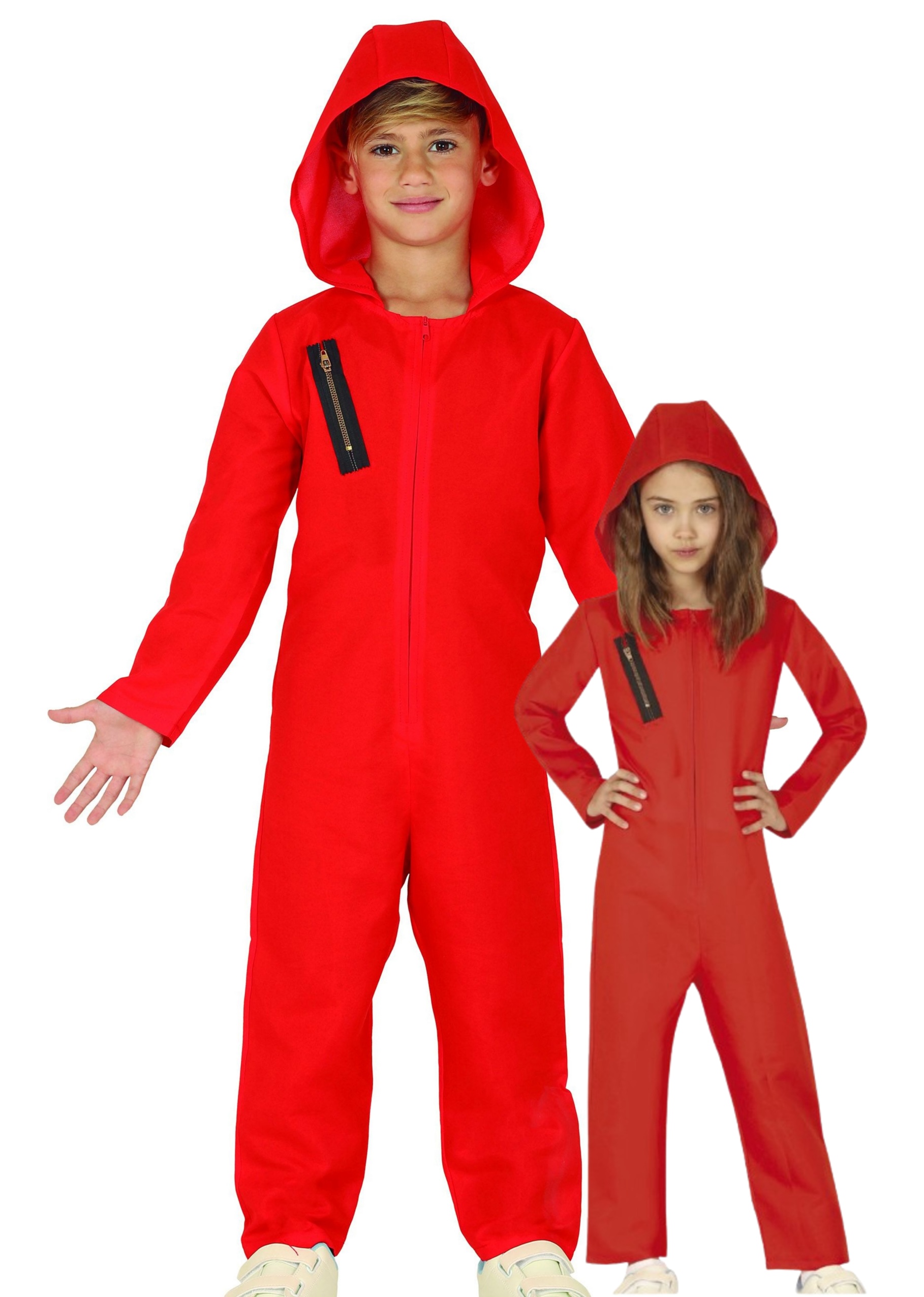 As seen on the popular TV show "La Casa De Papel - Money Heist". This costume includes a red one piece jumpsuit with hood.