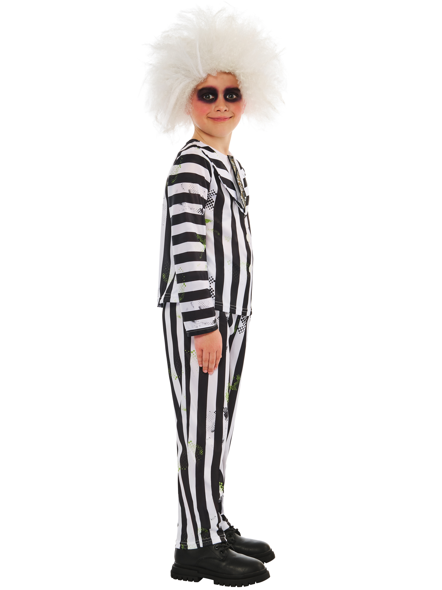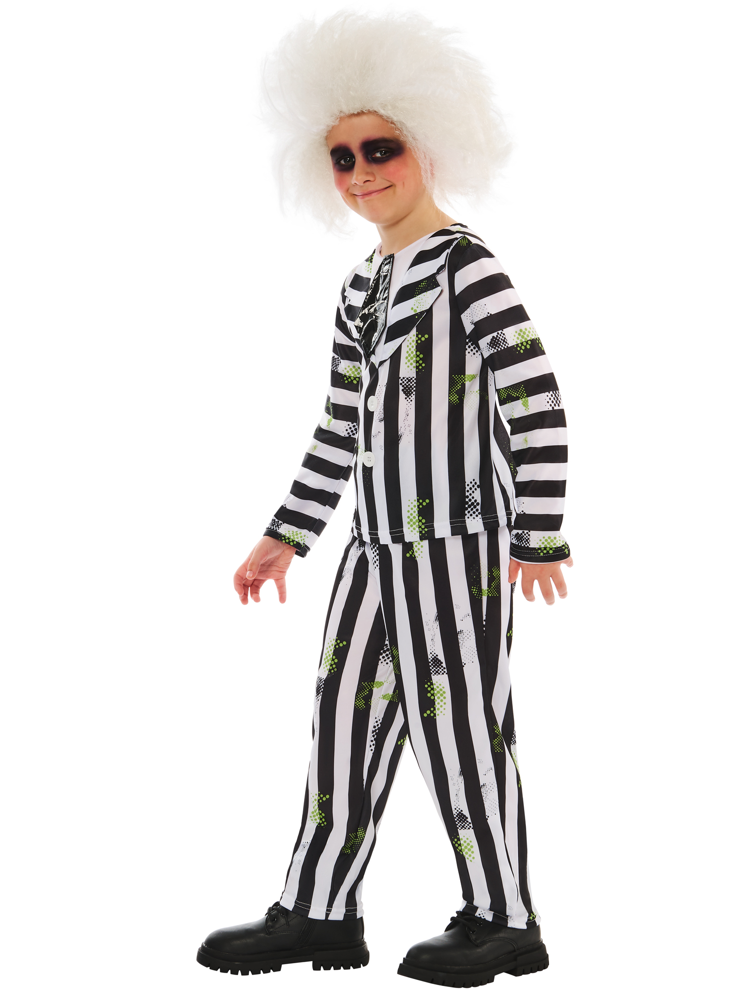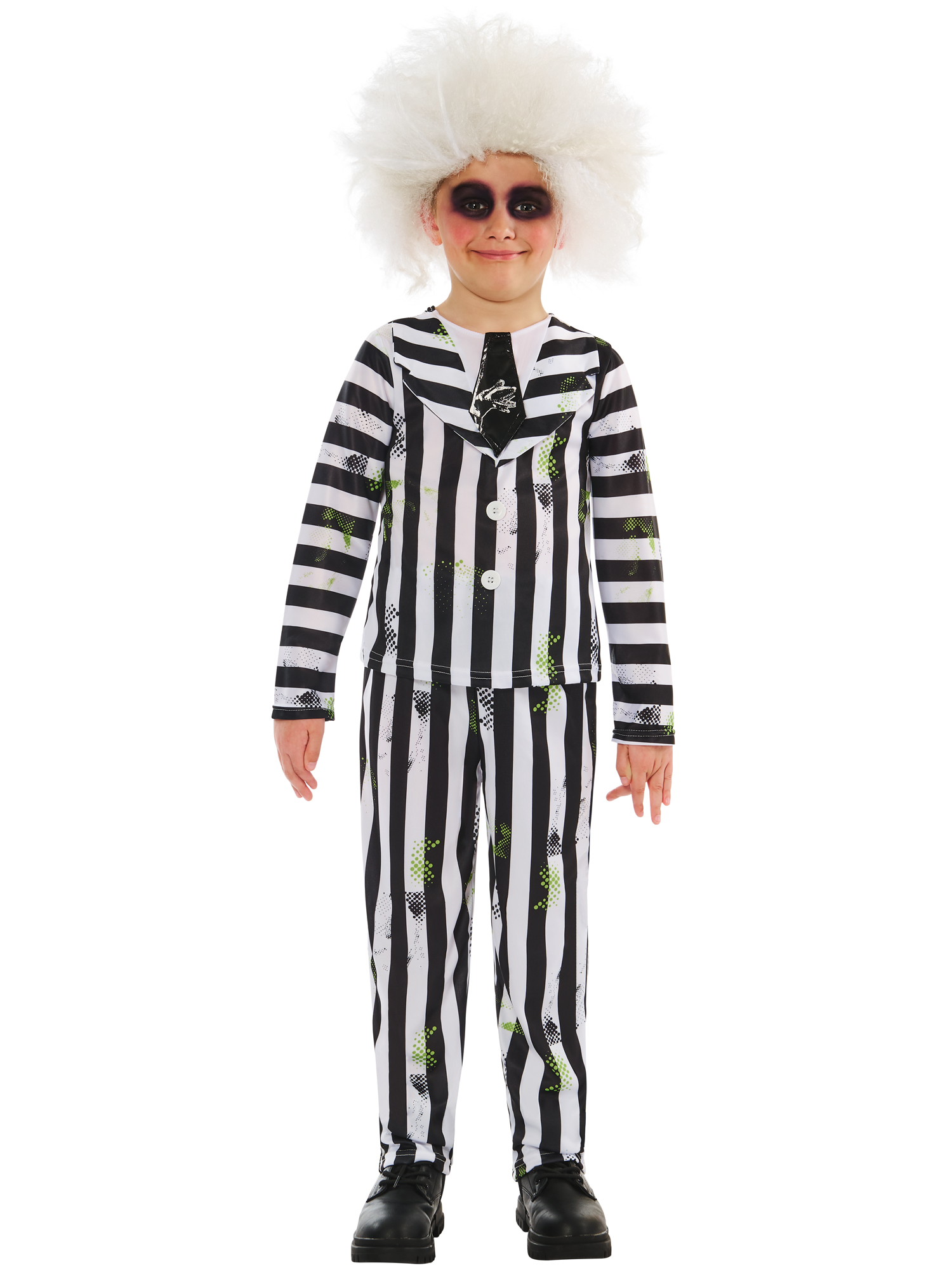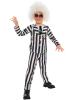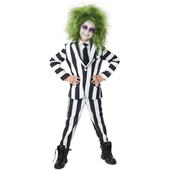 Bring the spooky fun of the iconic character to life with the Beetlejuice Child Costume! This unisex outfit includes a black-and-white striped jacket with a mock shirt and tie, paired with matching trousers for a complete look. The costume also features a 3D top and an authentic Beetlejuice wig to top it all off. Perfect for Halloween, costume parties, or themed events, this eye-catching ensemble is suitable for both boys and girls who want to transform into the ghost with the most!