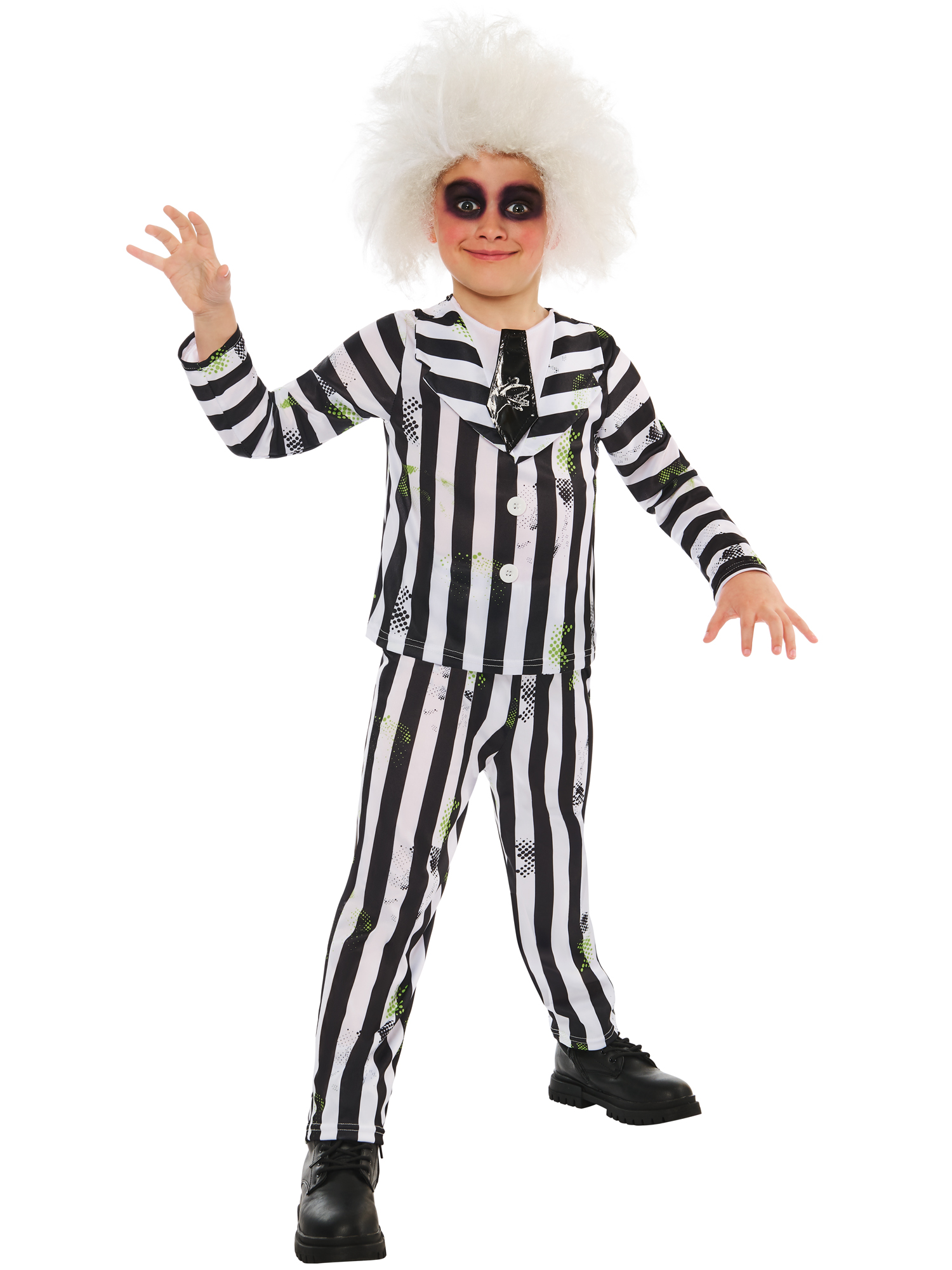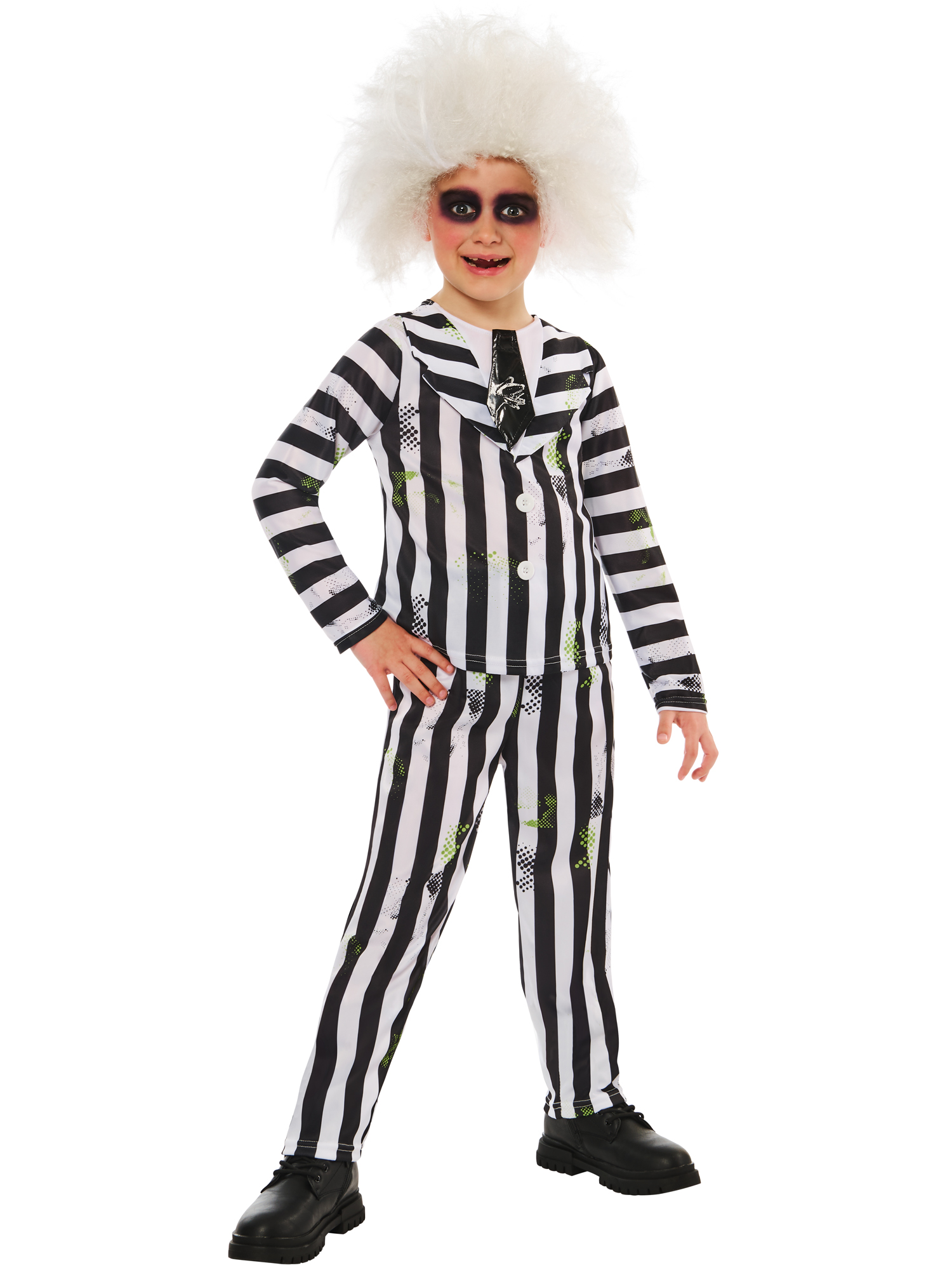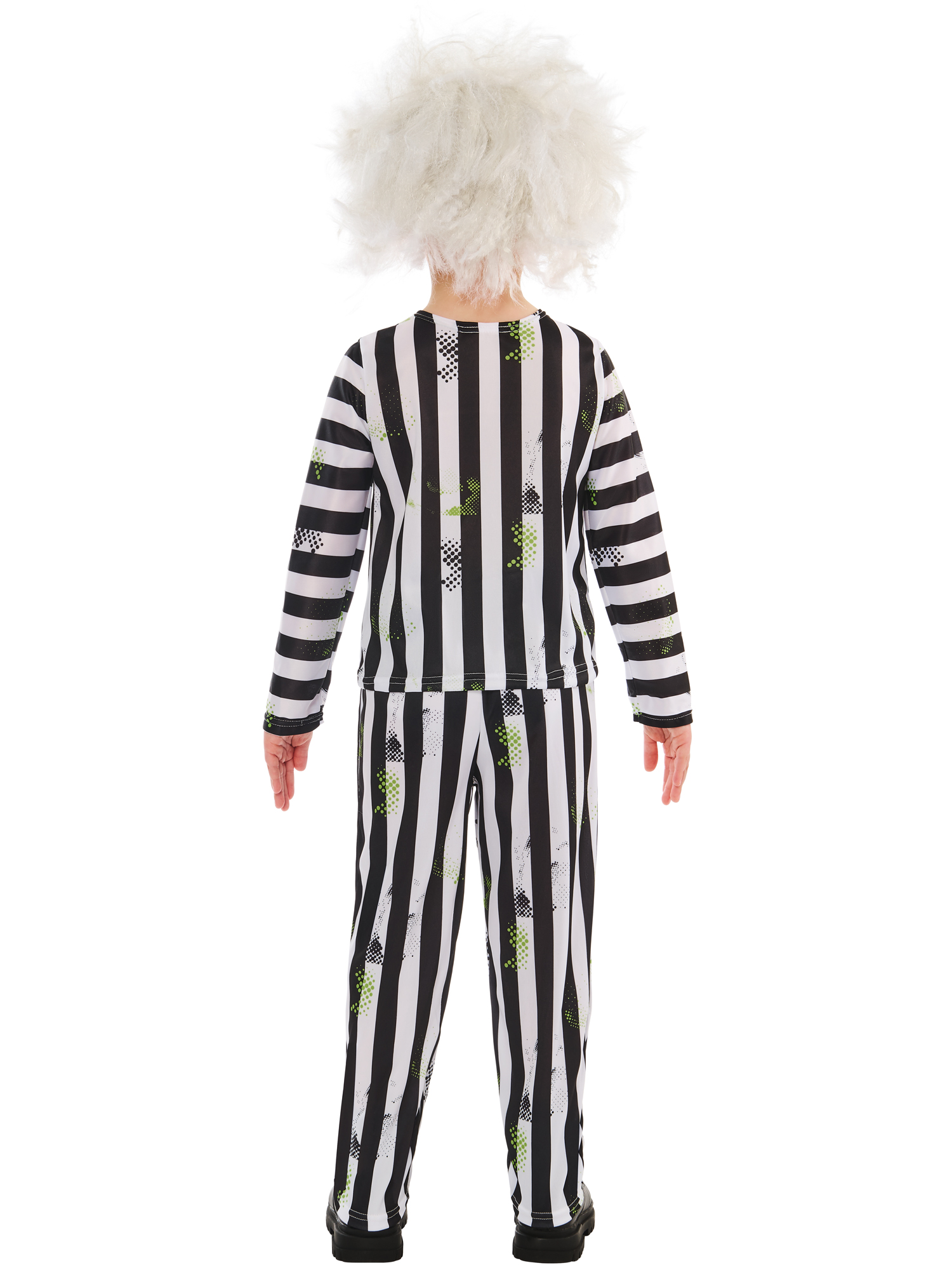 Bring the spooky fun of the iconic character to life with the Beetlejuice Child Costume! This unisex outfit includes a black-and-white striped jacket with a mock shirt and tie, paired with matching trousers for a complete look. The costume also features a 3D top and an authentic Beetlejuice wig to top it all off. Perfect for Halloween, costume parties, or themed events, this eye-catching ensemble is suitable for both boys and girls who want to transform into the ghost with the most!