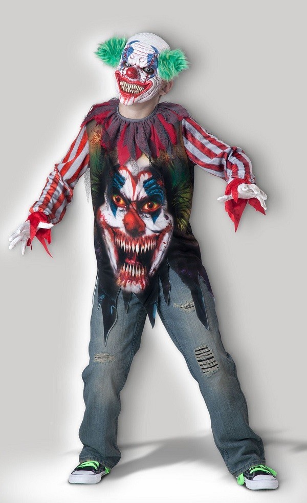 This Kids Big Top Terror Costume includes a top with clown print and collar. To complete the look a sculpted mask with plush hair is also included.