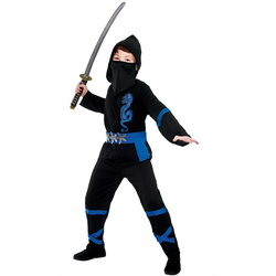 This Kids Power Ninja costume includes a black top with a blue printed dragon and a hood. Also included is a pair of trousers and a blue belt.