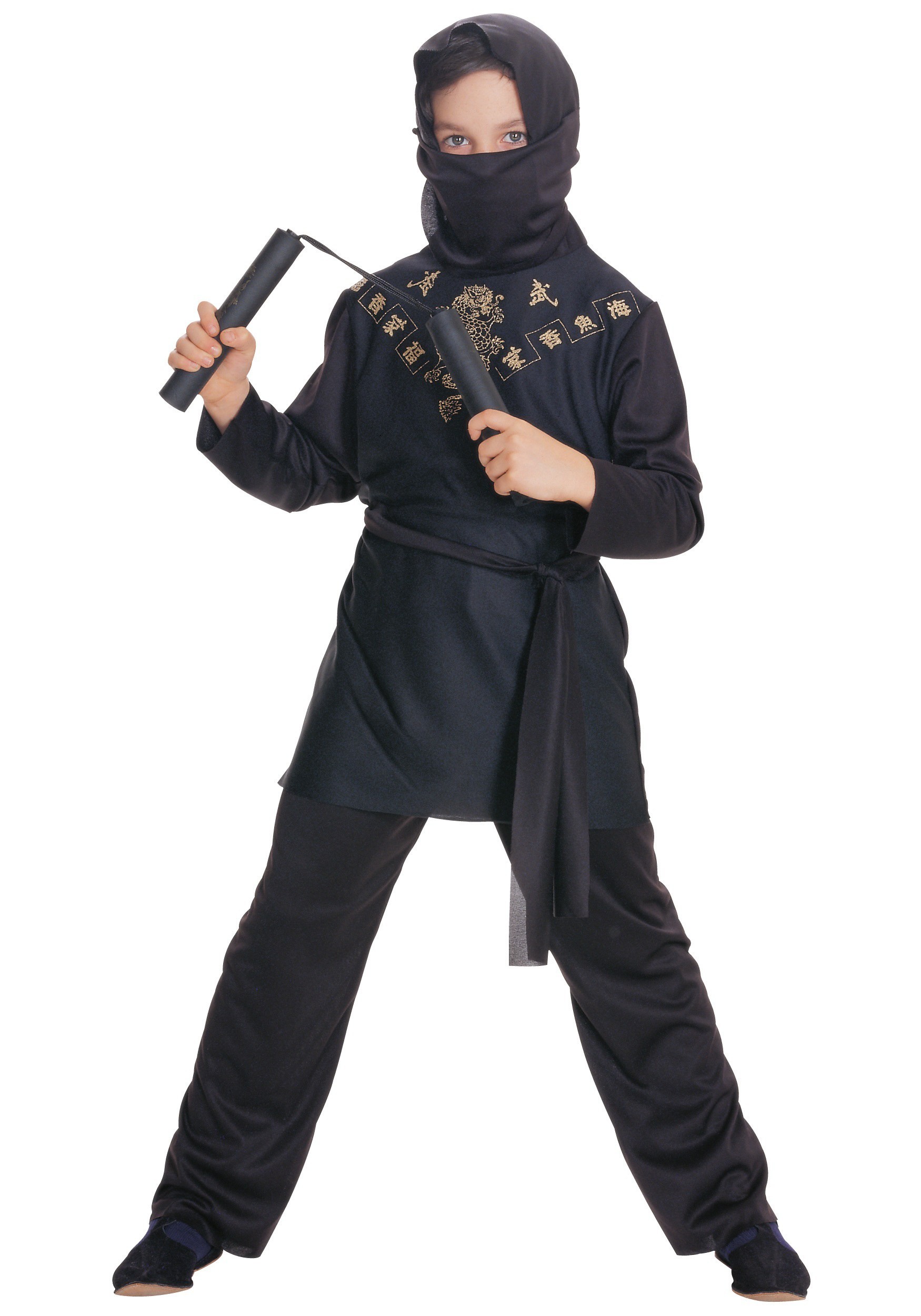 The Black Ninja costume is sure to be a head turner. This predominantly black costume includes a tunic with hood and a pair of black trousers. Also included is a face scarf and waist sash.