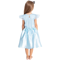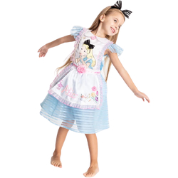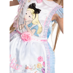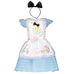 Your 'Alice in Wonderland' book lover will love our Disney Alice costume. The beautiful light blue dress has a striped chiffon overskirt with a cute embroidered apron. The bodice has a picture of Alice dreaming on the front, with a pink chiffon ruffle & sequin trim, a sparkly Peter Pan collar, frilled blue chiffon sleeves and pink rose details to the collar & waist. It comes complete with a pretty black bow on an alice band to compliment the look.
