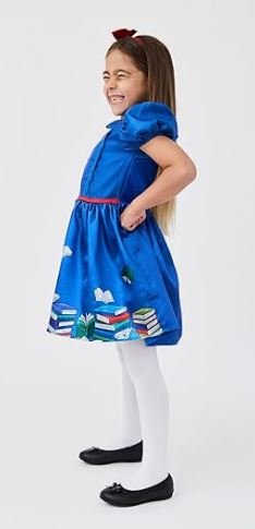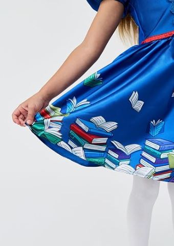 The costume features a bright blue dress with short puff sleeves, decorative buttons, and a colourful book-themed skirt design that captures a love of reading. A matching red bow headband completes the look, adding a sweet and recognisable finishing touch. Comfortable and easy to wear, it’s ideal for all-day school events.