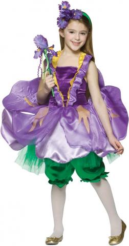 This adorable Botanicals Iris costume includes a purple, lilac, and orange dress with petal skirt and green tulle underskirt, green pantaloons and green headband with attached purple Iris flower. To complete the look the Iris wand with green stem and ribbons is also included