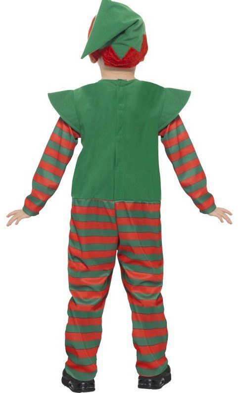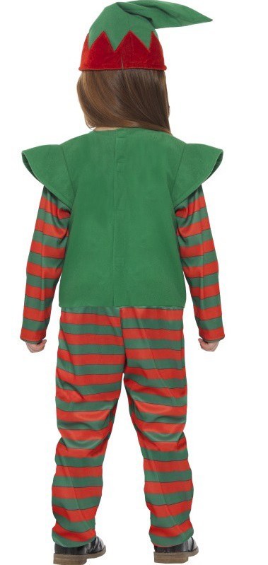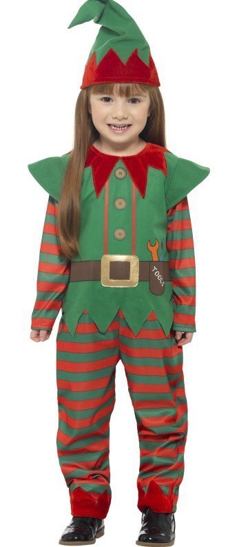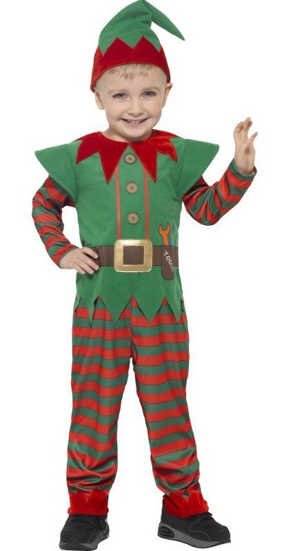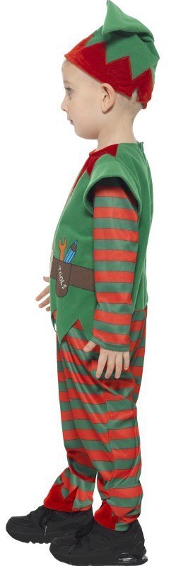 Elf Toddler costume includes a red and green one piece jumpsuit with a matching hat.