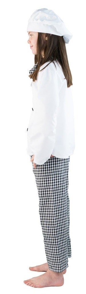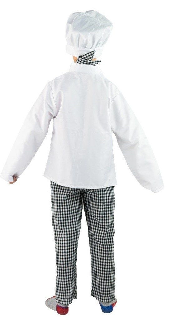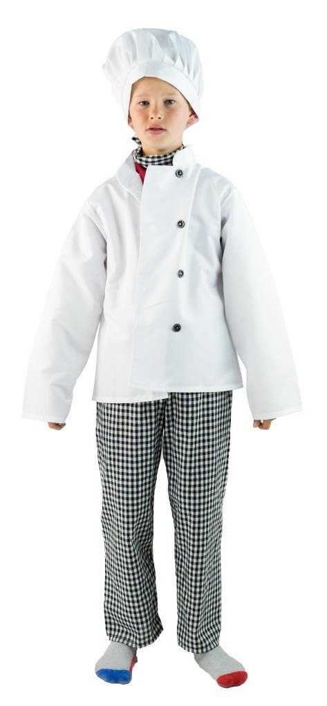 Cook up a storm with our Kids Cook costume. Included in this costume is a white chef top with button detailing and a pair of black and white trousers. Costume also included a matching scarf.