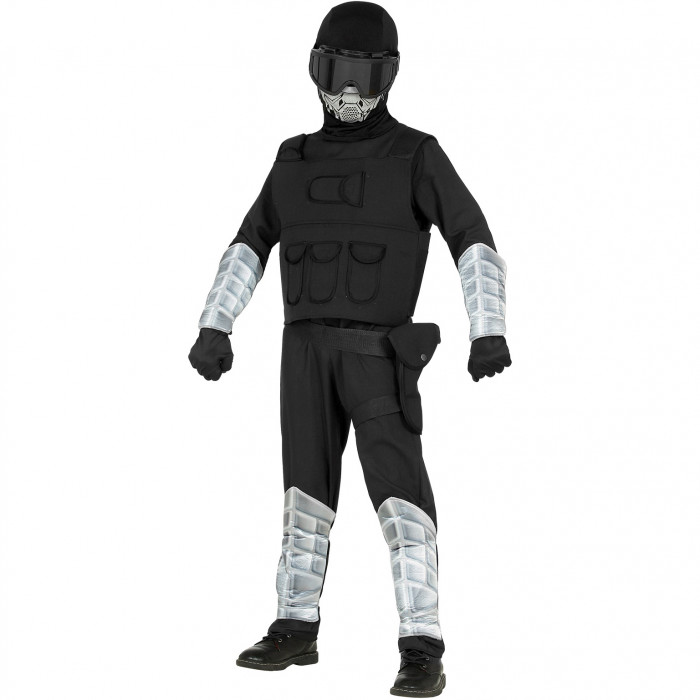 Included is a jumpsuit, a utility vest, a hooded mask, goggles and a belt with a holster.