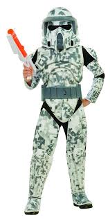 This Kids Star Wars Arf Trooper costume includes a one piece printed jumpsuit with attached armour and shoe covers. Also included is a belt and a two piece mask.
