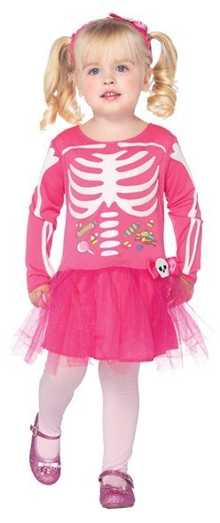 This cute Kids Candy Skeleton costume includes a glitter tulle petticoat dress with bone detail and matching bow headband.