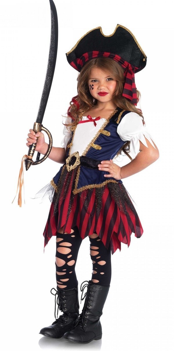 This Caribbean Pirate Costume includes a white shirt with attached brown vest with jagged ends, attached vest and waist sash. The costume also comes with a matching head scarf.