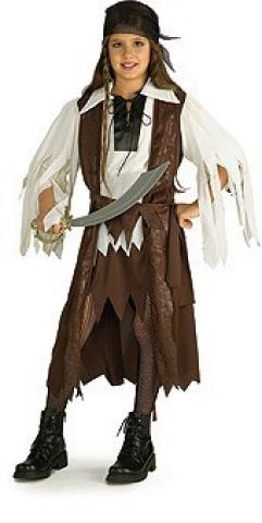 This Caribbean Pirate Queen Costume includes a brown and white dress with jagged ends, attached vest and waist sash. The costume also comes with a matching head scarf.