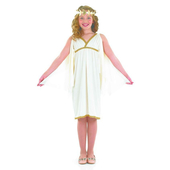 This Child's Cleopatra Costume features a white dress with cap sleeve and a sheer drape front with sparkling gold stripes, as well as an elegant collar and matching belt.