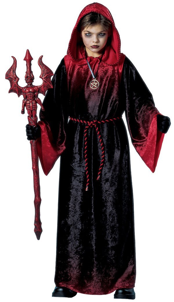 Our gruesome Child Gate Keeper Costume includes a black velvet look robe with red edging, attached red hood and a red and black waist tie cord.