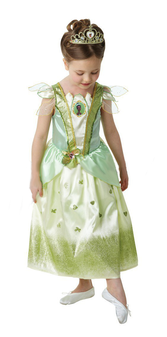 The famous Princess Tiana Disney character is a pretty, faux satin dress in beautiful grass green and yellow colour shades with glittering green and gold design, petal shape mesh sleeves, flower detail and a Tiana Princess print on the chest.