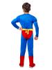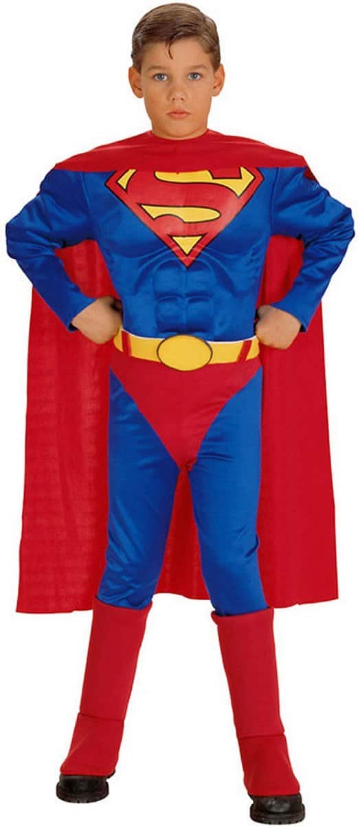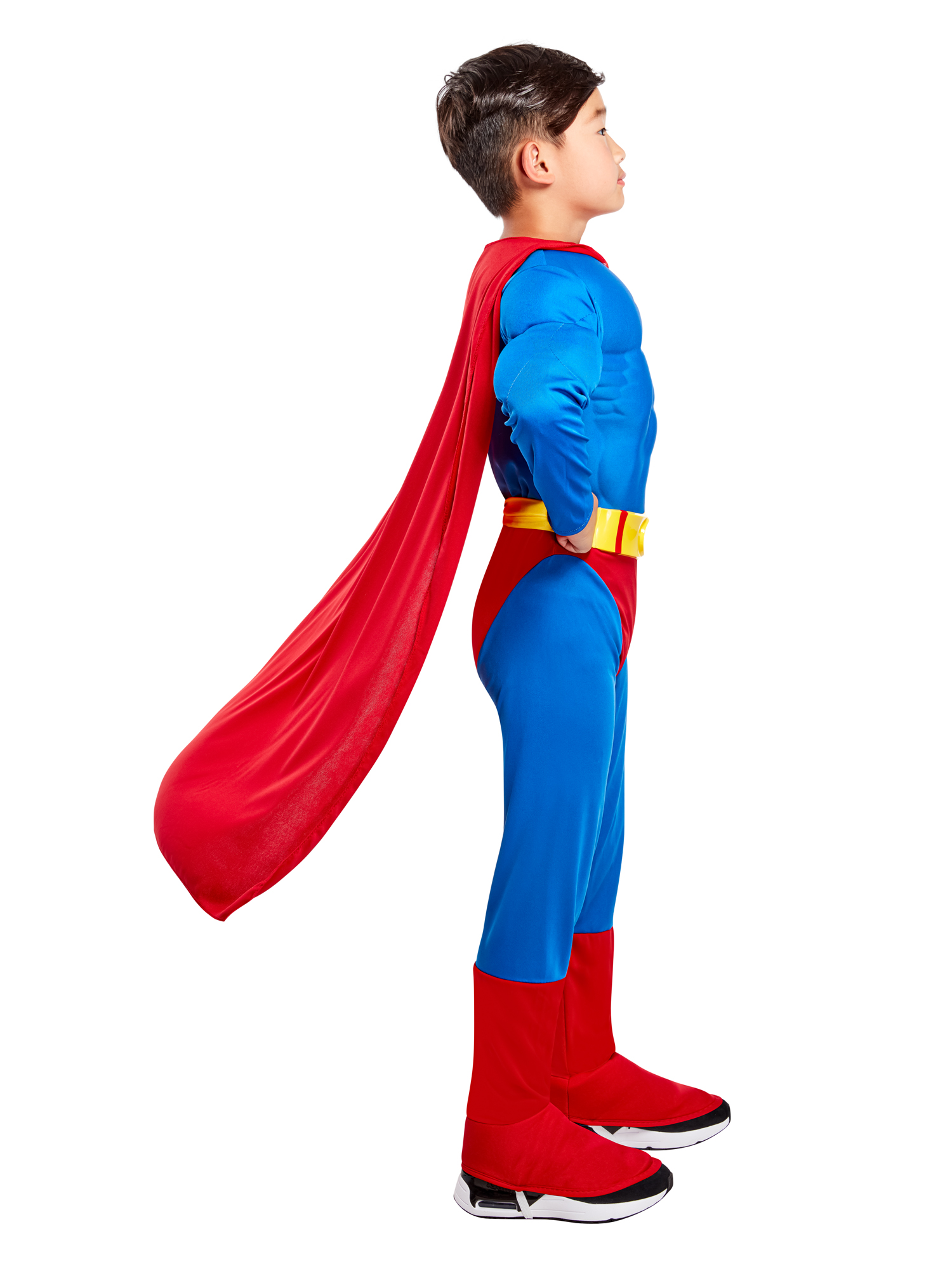Child's Muscle Chest Superman Costume includes cape, "Muscle Chest" jumpsuit with attached boot tops and belt.