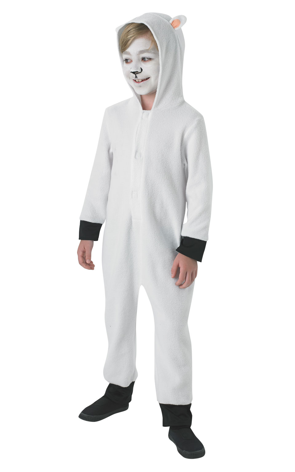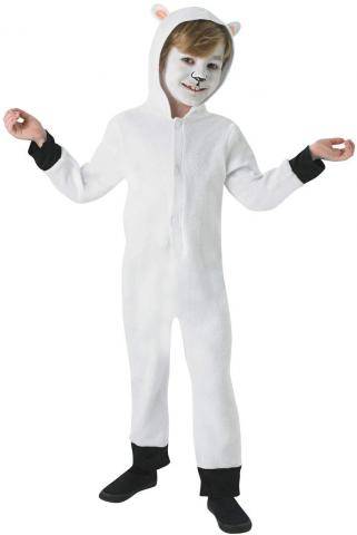This Child's Nativity Sheep Costume is a cream and white faux fur jumpsuit with attached hood with a tail.