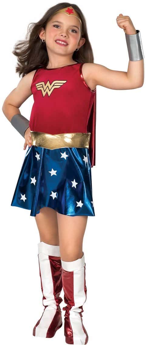 This original take on the classic character of Wonder Woman includes a faux velvet polyester dress with embroidered logo on bust.