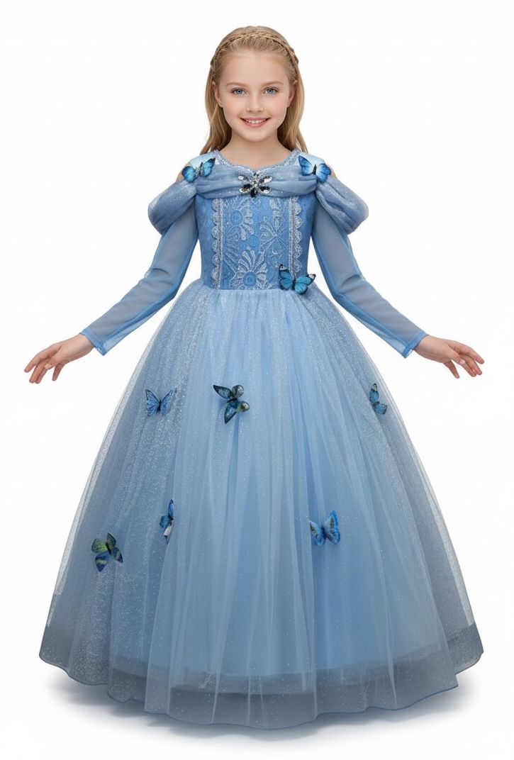 This Kids Cinderella Costume includes a long sleeved dress with a sparkly glitter over skirt.