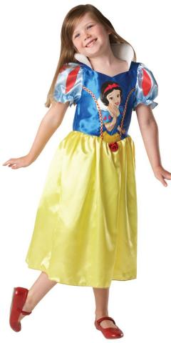 This pretty Snow White Classic Disney Princess Dress features a royal blue stretch satin bodice with printed Snow White detail, woven applique trim and elasticated puff cap sleeves.