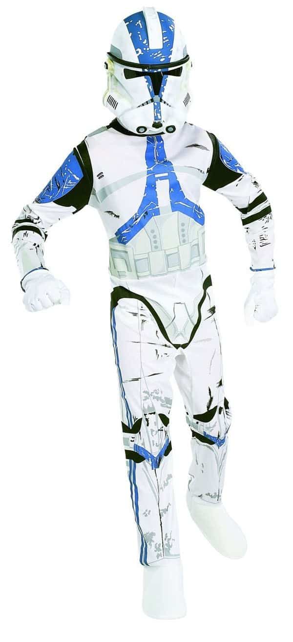 Includes detailed Clone Trooper printed jumpsuit with attached boot covers, PVC mask with blue, black and white Revenge Of The Sith design.