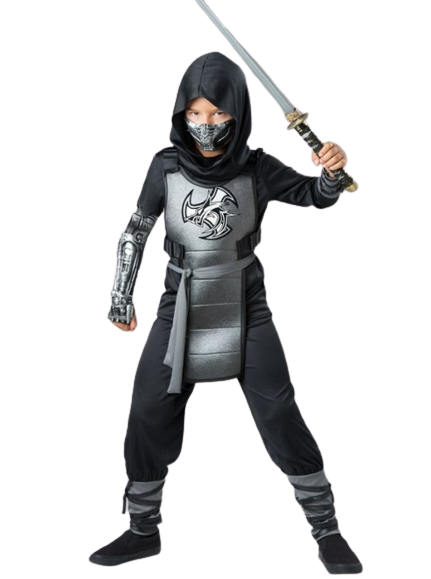 Deluex quality Kids Combat Ninja costume Includes a hooded shirt with photo-real printed Cyborg arm, a tabard with printed Ninja pants, waist sash and a forearm piece.