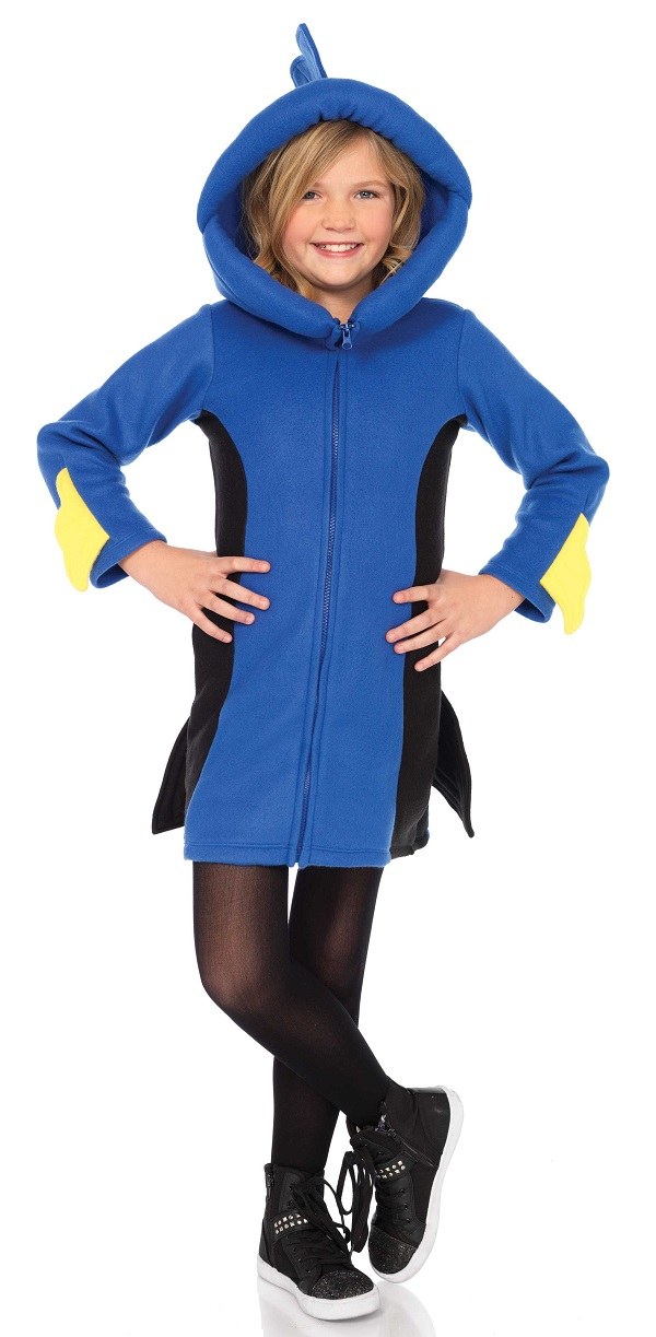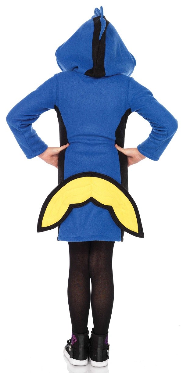 This Kids Cozy Blue Fish Costume includes a cosy fleece zipper front hooded dress with fin accents on the arms and back.