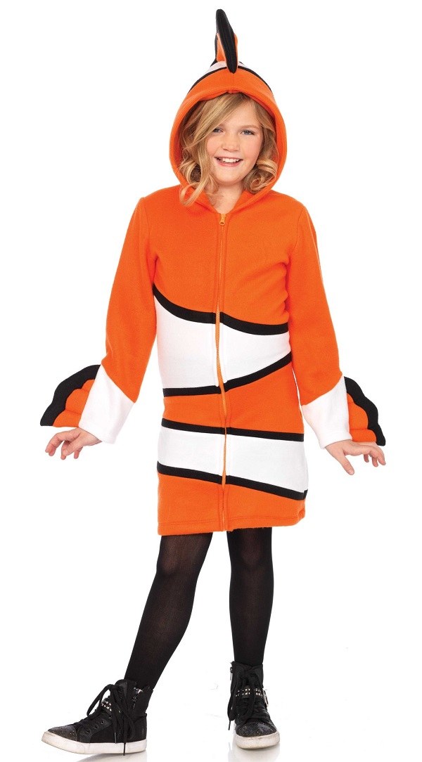 This Kids Cozy Clown Fish Costume includes a fleece zipper front hooded dress with fin accents on the arm and the back of dress.