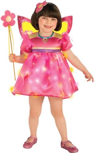 Included is a dress with light-up skirt, wings, hair flower, necklace and a wand.