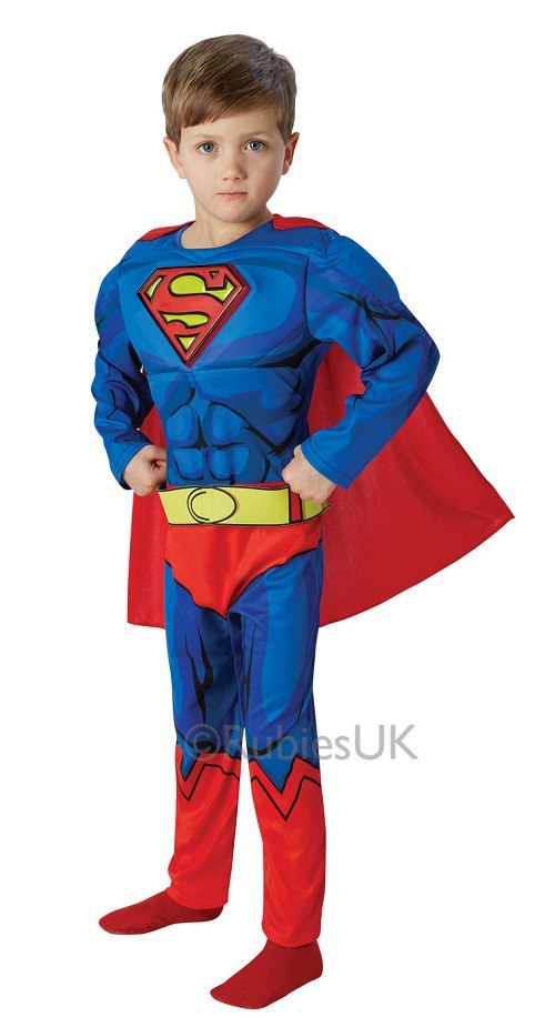 This Kids Deluxe Comic Book Superman costume includes a one piece padded jumpsuit and a red cape.