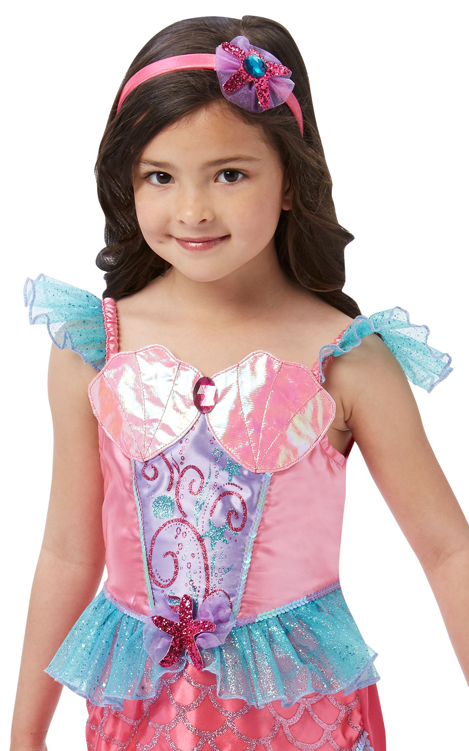 This fabulous Kids Deluxe Mermaid Princess costume features a long shimmering pink detailed dress with blue fringe throughout and a flowing fishtail styled skirt. To complete the look, a matching pink starfish headpiece and a starfish motif across the waistband is also included. Your little princess will be ready for any adventure under the sea with this enchanting costume!