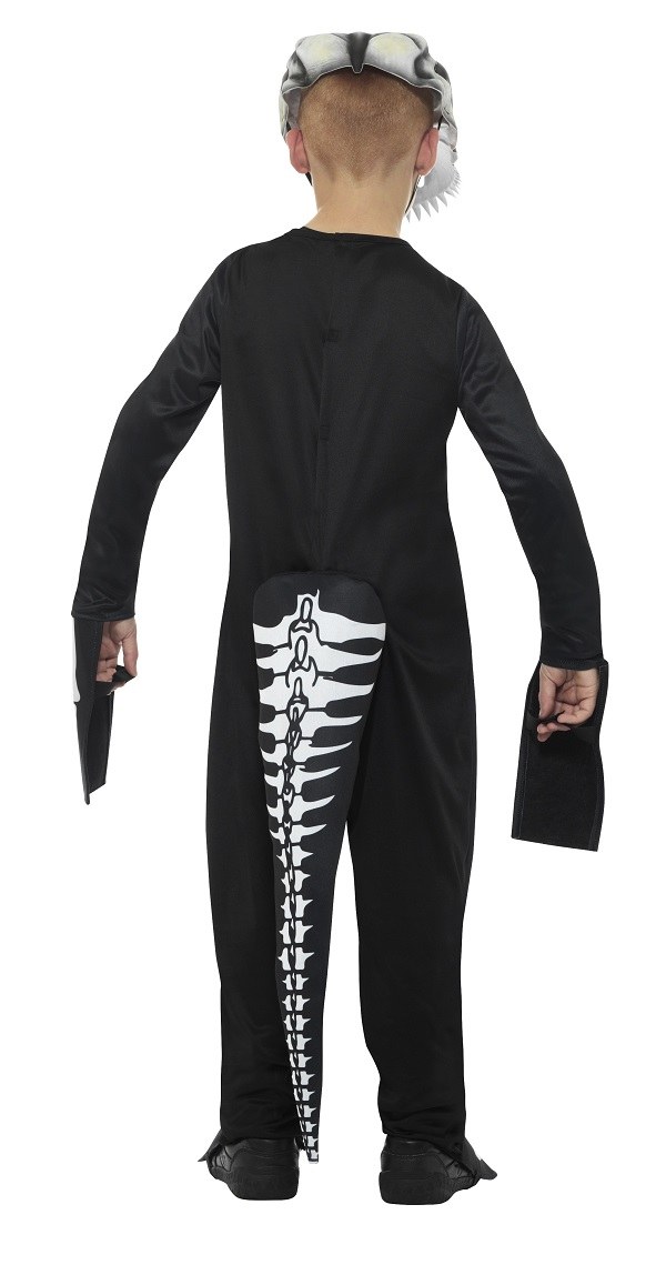 This Kids Deluxe T-Rex Skeleton Costume includes a one piece printed jumpsuit with a tail and a mask with lenticular 3D print eyes.