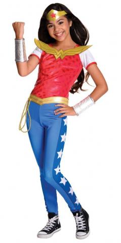 This Kids Deluxe Wonder Woman is a licensed costume. This costume features a red and white top with a printed Wonder Woman 3D logo along the neckline, blue trousers with white star designs and a gold belt to match. To complete the look, it also includes gauntlets and a gold and red signature tiara. Your little wonder women can save the world in this costume!