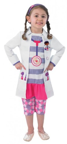 Fix all toys and stuffed animals just like Doc McStuffin with this adorable costume. It features a pretty white dress featuring a white jacket with mock printed jumper, printed stethoscope and an attached skirt. To complete the look, it also includes a pair of lilac leggings with pink spots and a matching elasticated glitter headband with flower accent.