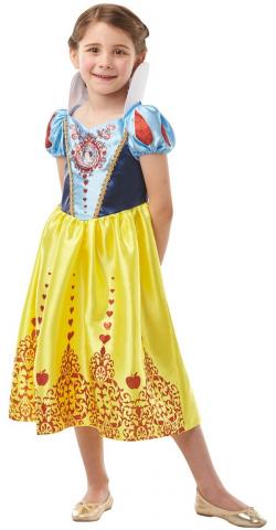 Officially Licensed Disney Gem Princess Snow White Costume for girls. This beautiful Snow White Costume includes a fabulous yellow and blue princess dress with the iconic high collar and puff sleeves to match. It also includes a satin bodice with character gem motif and satin skirt with sparkly glitter detail. Steer clear of the Evil Queen and any stray apples!