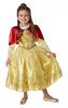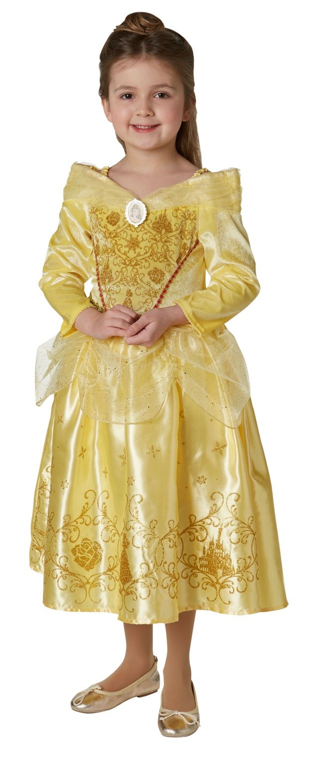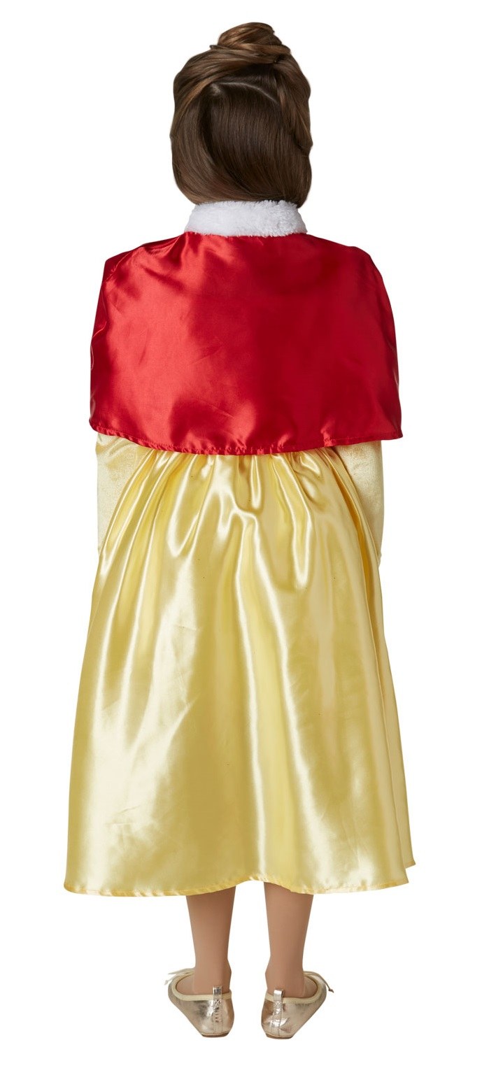 This Kids Disney Winter Belle Costume includes a long sleeved dress with sparkly glitter detail and a red cape with a white faux fur trim.