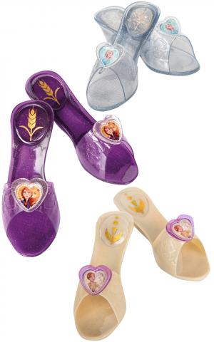 The purple shoes include an Anna character motif, the silvery blue shoes include an Elsa character motif and the gold shoes include a Anna prologue character motif.