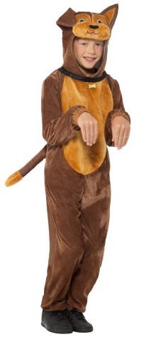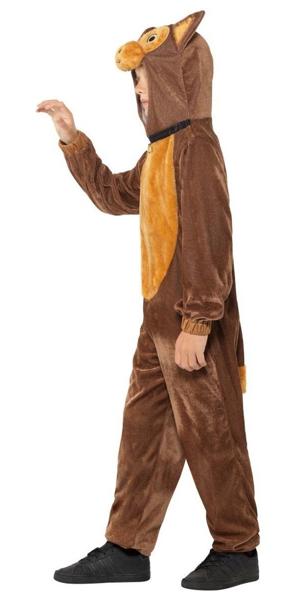 This costume includes a one piece soft brown hooded jumpsuit with a cute puppy face with tail and a collar.