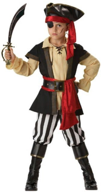 This Pirate Scoundrel Costume is an elite quality costume with all the accessories. The costume includes short black and white striped trousers, a cream long sleeved shirt with black lace detail and a short sleeved waistcoat with leather look trim. It also includes leather look boot covers, buckled belt, hat with attached red velour headband, red velour sash, sword, eye patch and a gold hoop clip on earring