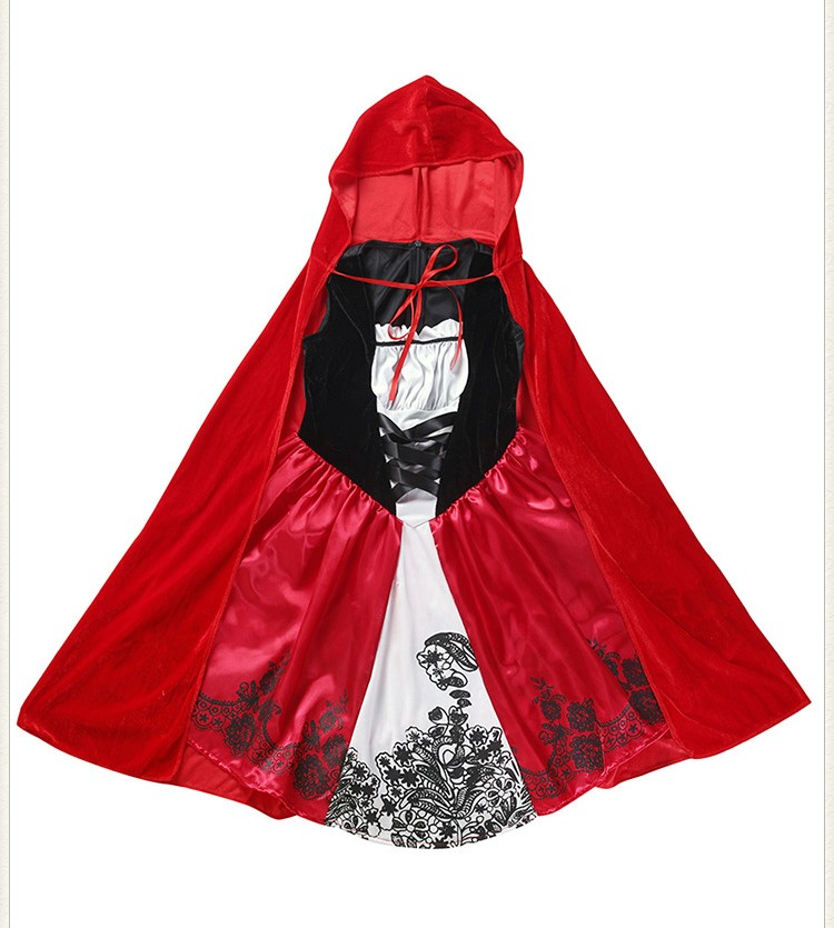 This dress features a black and white lace up detailed bodice and beautiful embroidery. It also includes a Red Velvet Cloak.