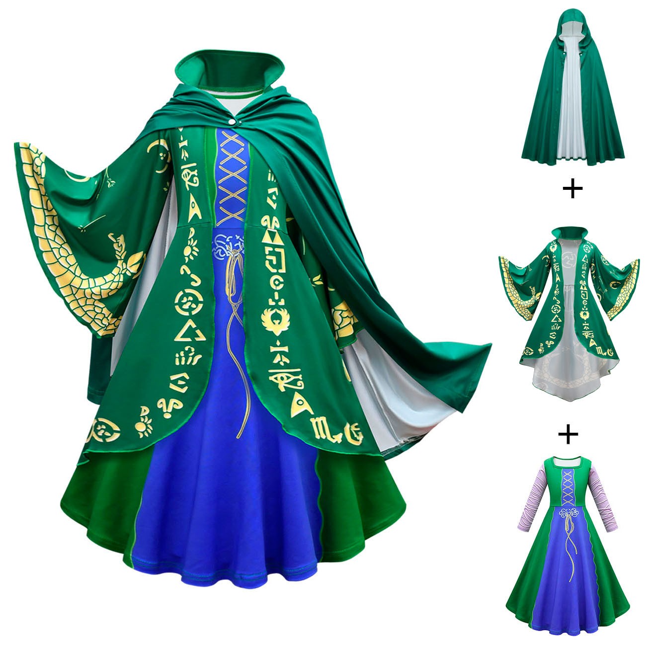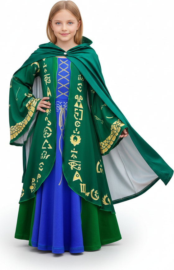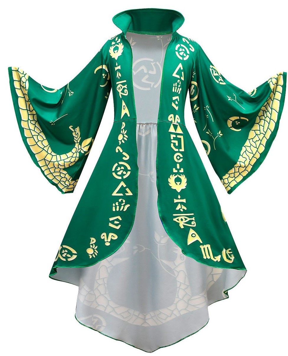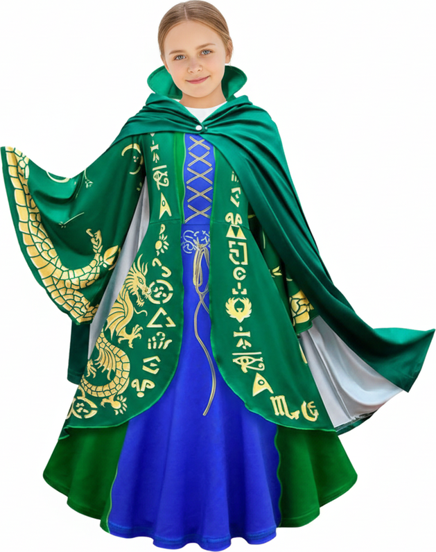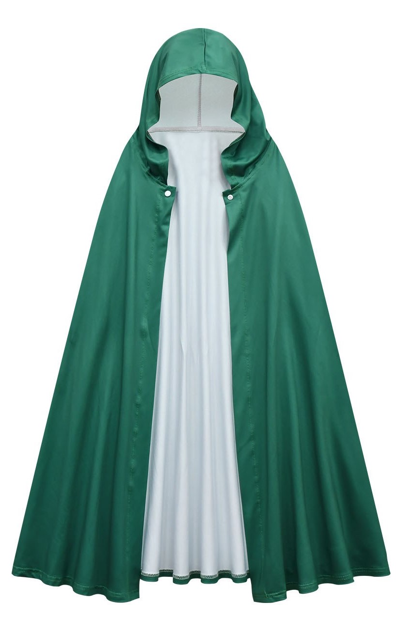 Included is a green and blue pattern dress with a green and yellow pattern robe and green hooded cloak.