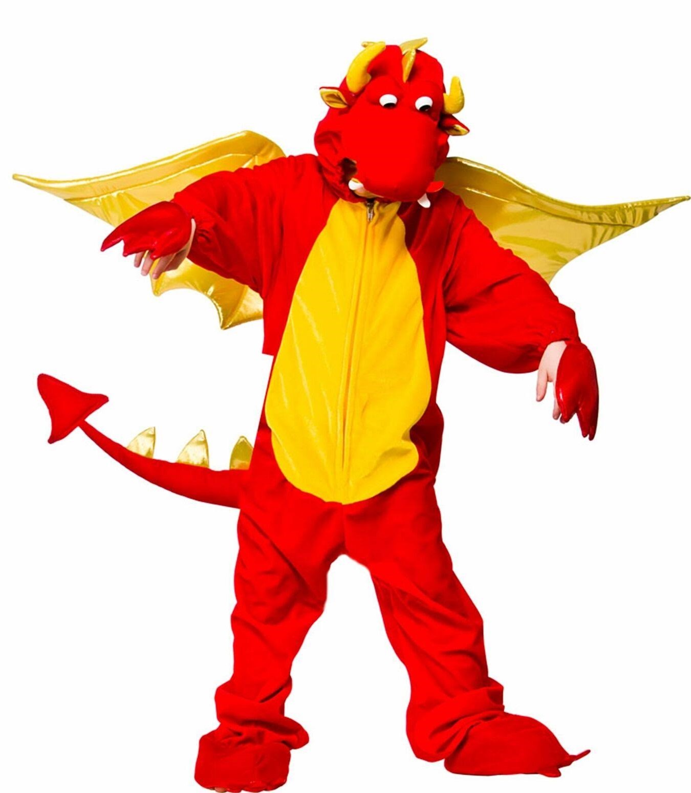 Children's Fire Breathing Dragon costume includes a red and yellow one piece jumpsuit with an attached tail and a matching headpiece with teeth and eyes.