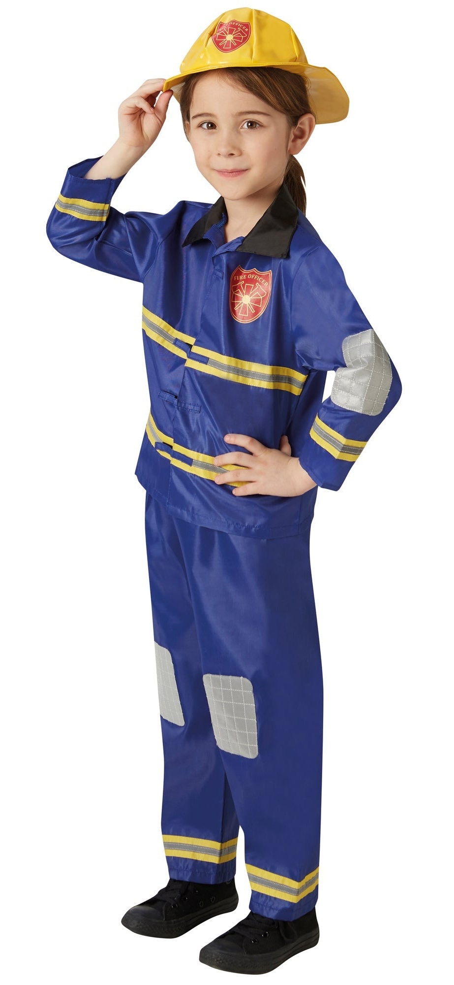 This Fireman Costume includes a blue jacket with yellow and silver shoulder patches and detailing around the cuffs and bottom of the jacket. The jacket also has a red and yellow fire officer badge on the front left. Jacket is velcro fastened. Matching trousers are also included, along with a yellow plastic fire helmet with crest.